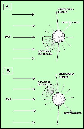 La formación de la coma es el elemento que permite localizar al cometa en observaciones visuales cuando se halla por término medio entorno a 3 UA del Sol. Es la observación de la nebulosidad de la coma lo que busca el cazador de cometas, una figura más actual que nunca, como confirma la circunstancia de que el reciente cometa C/1996 B2 fue descubierto el 31 de enero de 1996 por un fotógrafo japonés, Yuji Hyakutake. Hablando de la localización visual de los cometas, es oportuno hacer una breve consideración sobre la luminosidad de estos cuerpos celestes. Si el núcleo fuese un objeto inactivo bajo la luz solar, su magnitud dependería de la distancia al Sol (r) y de la distancia al observador ( Pero el núcleo es fuertemente reactivo a la radiación solar y por lo tanto la relación debe ser sustituida por En la cual la dependencia es del tipo rn. En la mayor parte de los casos los valores de n están compredidos entre 2,5 y 11,5. n es, por lo tanto, muy variable de un cometa a otro y, a menudo, también para un mismo cometa. A este propósito bastará recordar la gran desilusión asociada al cometa Kohoutek (1973 XII). El valor estimado inicialmente (4,0) lo habría llevado a la magnitud aparente -3, pero el parámetro n, por el contrario, bajó al valor 2,0. Por lo tanto, el cometa, en el momento de máxima luminosidad, solamente llegó a la cuarta magnitud. De las primeras observaciones espectroscópicas (por obra de G.B. Donati y W. Huggins en 1864) se descubrió que la coma de los cometas está constituida por compuestos del C, H, O y N. En la coma de un cometa que se acerca mucho al Sol se ven otras rayas importantes de emisión de metales en estado atómico, como Na, K, Mn, Cu, Fe, Co y Ni. Estos metales provienen de la vaporización del material meteorítico del núcleo. La doble raya amarilla del Na fue encontrada por primera vez analizando el cometa 1882 II en la proximidad del perihelio, situado solamente a 0,06 UA del Sol. El análisis detallado de las sustancias encontradas en la coma sugirió que las moléculas observadas no eran más que emanaciones del núcleo. Esto implica que las moléculas expulsadas del núcleo deberían ser más complejas (provienen de otras moléculas-madre). Estas moléculas madre constituyen la coma interna, estructura no directamente accesible a la observación, que originan, por disociación provocada por la radiación solar, las consiguientes moléculas-hijas (que a su vez constituyen la capa intermedia o coma visible). Las moléculas hijas son principalmente, la parte del radical OH, el carbono bi-molecular C2 que origina la banda de Swan, el cianógeno CN y el óxido de carbono ionizado CO+. La abundancia espectroscópica del oxidrilo OH+ y el hecho de que se viene encontrando un aumento de luminosidad de la coma a distancias inferiores a 3 UA (distancia a la que se llega a una temperatura que permite la evaporación del hielo de agua) induce a concluir que es el propio hielo de agua el que predomina entre los hielos cometarios. Lo sugiere también la presencia del hidrógeno. La confirmación llegó en 1970 cuando el satélite QAO2 encontró en torno a la coma del Tago-Sato-Kosoka (1969 IX) una capa enorme de hidrógeno, inobservable desde la Tierra, mediante de observaciones en el ultravioleta. Del análisis de los datos, encontrados también gracias al satélite, se puede deducir que el agua constituye alrededor del 80% de las moléculas que emanan del núcleo. A parte del agua, entre las moléculas madre hay, pero en cantidad mucho menor, anhídrido carbónico CO2, ácido isocianhídrico HNC, amoniaco NH3, cianuro de metilo CH3CN y metano CH4. El estudio de la abundancia relativa del ácido isocianhídrico HNC respecto al ácido cianhídrico HCN observada en el cometa Hyakutake han llevado a W.M. Irvine y colaboradores (1996) a constatar como tal relación es muy similar a la observada en las nubes moleculares interestelares. Se constata asimismo que es distinta de la relación de equilibrio que se encuentra en la zona más externa de la nebulosa solar, donde se piensa que se han formado los cometas. Este hecho, del cual se han propuesto varias explicaciones, no hace más que confirmar que todavía hay muchos puntos oscuros en la compresión plena de estos objetos celestes. De observaciones de radio del Hyakutake también emerge la presencia de abundantes emisiones (2,2 x 1026 moléculas/s) de etano (C2H6) con el pico en la región nuclear, hallazgo que induce a considerar el etano como molécula-madre y no como producto de disociación (Cremonese, 1996). Causó cierta perplejidad el descubrimiento de emisiones de rayos X de baja energía en el cometa Hyakutake, realizado el 27 de marzo de 1996 por el satélite alemán en órbita ROSAT (IAUC 6373). Actualmente este fenómeno ha sido observado en otros ocho o nueve cometas y ya están en estado avanzado hipótesis que explicarán las emisiones. Una primera hipótesis prevé un mecanismo de captura de rayos X de origen solar por parte de la nube molecular de agua y la sucesiva reemisión en un proceso de fluorescencia. Por otra parte, una segunda hipótesis explica el fenómeno recurriendo al mecanismo de reflexión de rayos X de origen solar por obra de los granos submicroscópicos del polvo expulsado del núcleo (Caprara, 1996; Cremonese, 1996). Sugerida por los investigadores de la Universidad de Michigan, la hipótesis que se piensa más plausible es que el fenómeno es debido a la violenta interacción entre los átomos y las moléculas de la coma con el viento solar. Esto llevaría a la captura de electrones, cuya sucesiva caída a niveles energéticos inferiores tendría como resultado la emisión energética en la región de rayos X del espectro. La colaSiendo tradicionalmente lo más característico de un cometa (y lo más espectacular), la cola no siempre acompaña las apariciones de estos cuerpos celestes. En otras ocasiones, las colas alcanzan proporciones considerables, 