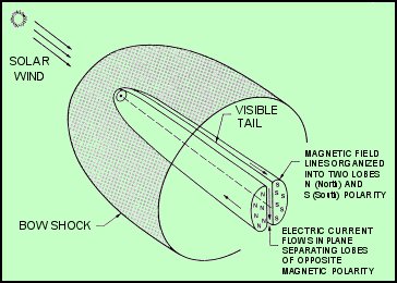 ![]() A) Si la rotación del núcleo es acorde con el movimiento de revolución, la reacción del chorro empujará al cometa hacia delante en su órbita, alargándola y haciendo que aumente el periodo (retardo en los pases sucesivos). B) Si el núcleo rota en dirección opuesta a su movimiento orbital entorno al Sol, el efecto cohete causará una fuerza desaceleradora que empujará al cometa hacia el interior en dirección al Sol, con la consiguiente disminución del periodo (anticipo en los pases sucesivos).Resumiendo, un cometa está, esencialmente, compuesto por un núcleo de aglomerado de hielo y polvo, cuya estructura interna nos es desconocida, y que orbita en torno al Sol. La subida de la temperatura al aproximarse al perihelio provoca la evaporación del hielo, con la consiguiente expulsión de materiales volátiles y polvo que forman la coma. La interacción de esta estructura con el campo magnético interplanetario y con el viento solar origina una estela visible, denominada cola. La cola, siempre revuelta, señala (como una bandera) la dirección opuesta al viento solar (véase figura 2). ![]() Reproducción de: Hamilton, http://bang.lanl.gov/solarsys/comet.htm, mayo 1996.Creo que es interesanate, antes de pasar a analizar la morfología de un cometa, presentar una tabla que muestra la abundancia relativa de las sustancias gaseosas volátiles (hielos) y no volátiles (a la temperatura terrestre ordinaria) de los cuerpos del Sistema Solar. Verificamos de este modo la consistencia de la teoría que identifica la zona de Urano y Neptuno con la zona principal de formación de los cuerpos cometarios.