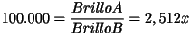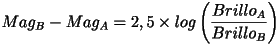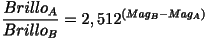 Ejemplo 5: Vamos a repetir la tabla que hemos hecho en el ejemplo 3, pero esta vez con el valor real del factor de brillo que hemos calculado en el ejemplo 4. Así tendremos la correspondencia exacta entre diferencias de magnitudes y las diferencias de brillo reales. En la celda F1 escribimos "Dif Mag". En la celda G1 ponemos "Dif Bri Real" para indicar esta vez la diferencia de brillo real y exacto. En la celda F2 ponemos la cantidad "1", en la F3 la cantidad "2", seleccionamos la celda F2 y la F3. Las dos quedarán dentro de un borde negro. Señalamos con el ratón en el cuadradito de llenado automático y arrastramos hasta la fila 35, generando la serie del 1 hasta el 34. En la celda G2 introducimos la fórmula "=D$2^F2". Al dar al ENTER, saldrá el número 2,51188643. Hacemos clic en la misma celda G2 y de nuevo cogiendo su esquina inferior hacemos llenado automático hasta la fila 35. Si en algunas celdas sale "#####" es que tienes que hacer más ancha la columna G, o bien disminuir el número de decimales. Y ahora ya tenemos la tabla de equivalencias exactas entre diferencias de magnitudes y diferencias reales de brillo. Fíjate que cada cinco magnitudes, el brillo corresponde a números redondos. Puedes comparar esta tabla con la otra. Sólo para diferencias de magnitudes muy grandes, la diferencia es apreciable. GeneralizandoYa sabemos como funcionan las escalas logarítmicas, y en concreto cómo funciona la escala de magnitud estelar. Podríamos generalizar nuestro conocimiento. Hasta ahora sabemos la diferencia de brillo real que hay entre dos estrellas de magnitud conocida, pero sólo de magnitudes enteras, como magnitud 3 ó 4. Pero en realidad hay estrellas que tienen un brillo intermedio entre estrellas de magnitud 3 y estrellas de magnitud 4. Por tanto esas estrellas tendrán que tener magnitudes con números decimales. Si tenemos una estrella de magnitud 2,7 y otra de magnitud 3,4 ¿cuántas veces es más brillante la primera que la segunda?. Pues tendremos que restar sus magnitudes y elevar 2,512 al resultado de esta diferencia. La fórmula matemática sería![]() El cociente de los brillos es igual al factor de brillo elevado a las diferencias de magnitudes.