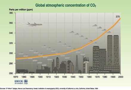 Para tratar matemáticamente la acción de los campos magnéticos en el interior estelar, deben adaptarse las cuatro ecuaciones principales que rigen el interior del Sol: la conservación de la masa, del momento, de la energía y el transporte energético. Esto se consigue añadiendo dos nuevos parámetros que dan cuenta del campo magnético y la turbulencia. Las ecuaciones de estructura así obtenidas son similares a las estándares, pero ahora aparece un término de dinamo, que puede tener grandes efectos: un campo magnético interno variable puede afectar a los parámetros globales. Los modelos numéricos que mejor reproducen las observaciones son aquellos en los que la densidad de energía magnética es equiparable a la energía que procede del movimiento turbulento. Este resultado parece bastante razonable, puesto que ambos factores están muy relacionados: el campo magnético induce el movimiento de las partículas, y éstas al moverse inducen campo magnético. ¿Existe el cambio climático? ¿Lo ha provocado la actividad humana?Los gases invernadero, fundamentalmente el dióxido de carbono, CO2, y el vapor de agua, pero también otros como el óxido de nitrógeno (NO2), el metano (CH4), los clorofluorcarbonatos (CFCs) y el ozono (O3) retienen la radiación infrarroja que emite el suelo como consecuencia de la incidencia directa de la radiación solar sobre la superficie. Sin los gases invernadero, esta radiación infrarroja se escaparía hacia el espacio. Un poco de efecto invernadero es bueno: si no existiera, la Tierra sería un mundo cubierto de hielo. Pero el crecimiento constante de la concentración de los gases invernadero, sobre todo dióxido de carbono, hace aumentar la temperatura media de la atmósfera terrestre. Este hecho está actualmente totalmente comprobado, como se observa en las gráficas que muestran la variación de la concentración de CO2 en los últimos 150 años. Este crecimiento no es lineal, sino exponencial. El problema es realmente grave.![]() Evolución de la concentración de CO2 durante los últimos 130 años. Datos del observatorio de Mauna Loa, en Hawai.El año pasado se reunieron en Shangai los científicos internacionales más importantes en el estudio del cambio climático, alcanzándose dos conclusiones fundamentales. La primera, que la mayoría del calentamiento observado durante los últimos 50 años es debido a gases de efecto invernadero. La segunda, que el calentamiento para 2100 será entre 1,4º y 5,8º si sólo se doblase la concentración actual de CO2 en 100 años. Una subida de 1,4º durante este siglo es un problema serio, pero subir 5,8º sería un desastre total. El calentamiento se realiza sobre todo en latitudes altas, provocando el deshielo de los polos y el consecuente aumento del nivel de los océanos como resultado de la fusión de enormes cantidades de hielo continental. La faz de la Tierra cambiaría totalmente, muchas islas desaparecerán, y grandes ciudades costeras quedarán bajo el agua. Además el cambio climático desastroso asociado a este aumento de la temperatura atmosférica media induce un desecamiento de las zonas continentales lejanas de los océanos, ampliándose los desiertos interiores, y una subida de la humedad en las zonas costeras, que se traducen en el incremento descontrolado de las lluvias y fenómenos atmosféricos violentos como huracanes. Ambas variaciones, destacando ésta última, están sucediendo ya. ¿Podemos prever qué ocurriría si doblamos la concentración actual de dióxido de carbono mediante los modelos climáticos que disponemos?. Diseñar un modelo climático de la atmósfera terrestre es un trabajo arduo por la complicación de conocer los propios elementos que intervienen (masas de aire, océanos, masas continentales), todos los parámetros internos (temperatura media atmosférica, densidad, nubes, humedad, dinámica atmosférica) y externos (radiación solar, cobertura vegetal, aerosoles liberados por volcanes, efecto invernadero) implicados, además de todas las interrelaciones que surgen entre ellos. Los ordenadores actuales más potentes tardan cerca de medio año en obtener resultados de los modelos numéricos climáticos. Se suelen despreciar los efectos del Sol en dichos modelos, pero recientes estudios detallados con códigos numéricos que sí incluían el efecto de la variabilidad solar concluyen que es importante tenerlo en cuenta, siendo además necesario para calibrar los datos numéricos con las observaciones. No obstante, el mayor problema para obtener una buena calibración sigue siendo que no se conoce con precisión cuál ha sido la variación solar debida a cambios internos en el último siglo, porque es algo que se ha comenzado a investigar hace muy poco tiempo. El experimento del Sextante del Disco SolarLa radiación solar puede variar tanto por fenómenos superficiales (manchas, fulguraciones, campos magnéticos fotosféricos) como por fenómenos internos que, como ya hemos comentado, son difíciles de medir. No obstante, la teoría indica que estas variaciones internas deben afectar a parámetros medibles observacionalmente, como la temperatura fotosférica, el radio solar y la energía emitida, además de en las propias oscilaciones solares. Durante la pasada década el departamento de Astronomía de la Universidad de Yale (EE.UU.) ha llevado a cabo un experimento, liderado por el profesor Sabatino Sofia, que conseguía medir pequeñas variaciones del radio solar, superando en más de 100 veces a las estimaciones anteriores. Dicho experimento, que recibió el nombre de Solar Disk Sextant (SDS, Sextante del Disco Solar), también medía la forma del disco solar, y sus variaciones temporales. Se lanzaba en un globo aerostático sobre el desierto de Nuevo México, alcanzando una altura de 36 kilómetros, para minimizar problemas debidos al movimiento de las capas de aire de la atmósfera. La precisión del experimento es tan asombrosa que en sólo 20 minutos 