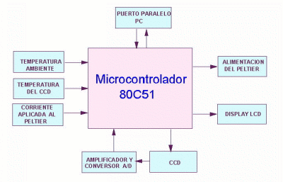 Diagrama de bloques.La figura 2 muestra esquemáticamente el funcionamiento de la cámara. El núcleo del circuito es un microcontrolador de la familia 8051 sobre el que corre un programa escrito en C.La comunicación con el PC se efectúa vía puerto paralelo. La elección del puerto paralelo se hace en base a poder usar cualquier ordenador portátil. Para controlar la temperatura del sensor, el microprocesador lee la temperatura en este y la del ambiente. En función de estas dos variables se decide automáticamente a que temperatura mínima se puede llegar. El proceso de enfriado se hace gradualmente. De esta forma se evita que los bruscos cambios de temperatura puedan dañar al sensor. Durante veinte minutos, la corriente generada por la alimentación del peltier va aumentando escalonadamente hasta llegar al punto de trabajo. Aunque la alimentación del peltier se controla digitalmente mediante un conversor DA, la corriente que realmente circula es chequeada y presentada en la pantalla de cristal líquido.