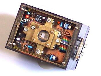 Cámara CCD para astronomía CG-2.Hoy la cosa es más sencilla puesto que a continuación llegó The CCD Camera Cookbook de Richard Berry, un libro modesto pero con un mérito irreprochable: consigue que personas con conocimientos técnicos muy escasos, pueda montar una cámara que está dando buenos resultados. A la hora de construir una cámara de estas, la mayoría de los componentes necesarios pueden conseguirse en tiendas normales de componentes electrónicos. Pero el principal no. Conseguir un sensor CCD es difícil. No es cuestión de andar eligiendo alegremente a ver cual se adapta mejor a nuestras necesidades, sino de cual podemos conseguir. Encontrar el TH7852 en España no fue demasiado difícil puesto que en Madrid existe una delegación de Thomson CSF. Este chip, bueno para empezar, es el más pequeño del fabricante (144x218 pixel). El siguiente de Thomson es el TH 7863, de mayor resolución (384x288 pixel de 24 um), es el doble de sensible y menos ruidoso. Se utiliza en algunos observatorios y por ejemplo, la sonda espacial Clementine lleva instalado uno. Un sensor más moderno muy usado actualmente en cámaras de grado medio es el KAF-0400. Tiene 768x512 pixel de 9 um. Gracias a su tecnología MPP no necesita ser enfriado demasiado, con lo cual queda paliado muy considerablemente el problema de la formación de escarcha. Actualmente es posible conseguir sensores CCD por otros caminos. Gracias a la proliferación de los equipos multimedia domésticos, los precios de las cámaras digitales para PC están por los suelos. El chip que llevan estas cámaras puede resultarnos útil. La cámara QuickCam montaba recientemente el TC255 en su modelo para blanco y negro. Es el mismo que ha usado Celestron para su PixCel 255. Pero sin duda, el camino más seguro es el abierto por la Cookbook. Todos los componentes imprescindibles pueden ser adquiridos en University Optics. Podemos elegir un chip pequeño y barato, el TC211 de 192x165 pixels, es el usado por la ST4. Pero la elección más frecuente es el TC245, bastante superior. A efectos prácticos tiene 252x242 pixels.