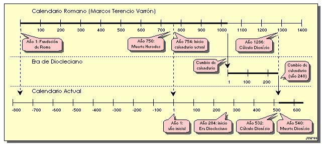 El Calendario Diocleciano.La Era de Diocleciano, un cómputo de tiempo intermedio entre el romano y el actual como vemos en el gráfico 1, tiene como origen el 29 de agosto del año 284 dC. Aproximadamente con esta fecha, que coincide con el inicio del gobierno de Diocleciano, empieza el año en el calendario Copto, usado en Egipto y Etiopía. Diocleciano (245-313 dC) fue emperador romano a la muerte de Numeriano, abdicando a favor de Galerio el 305 dC. El cómputo de Dionisio, del que hablaremos seguidamente, convirtió el año 248 Anno Diocletiani en el año 532 Anni Domini Nostri Jesu Christi, conocido como año 532 dC para abreviar.