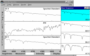 Clasificación de los espectros.Una vez obtenidos todos los espectros que necesitemos, seleccionamos la opción Classify Spectra dentro del menú Run. Se nos abrirá una nueva pantalla, donde podremos clasificar el espectro de la estrella. Esta pantalla se encuentra dividida en tres zonas, donde se colocarán espectros estelares como se muestra a continuación. La parte derecha de la pantalla recoge algunas funciones útiles a la hora de estudiar el espectro problema. Cargamos el nombre del archivo del primer espectro que queramos medir. Seleccionamos, en el menú Load, la opción Unknown Spectrum, y dentro de él, elegimos Saved Spectra (*.CSP). Por ejemplo, continuamos con ARL000.CSP. Se dibujará en la zona central, como representamos en la figura 4.