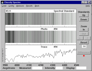 Figura 5. Espectro de la estrella 494 en escala de grises.Para encontrar el espectro que mejor se acerque al nuestro, abrimos el atlas de espectros estándars que dispone el programa, seleccionando la opción Atlas of Estandar Spectral dentro del menú Load. Para comenzar, seleccionaremos la Secuencia Principal de estrellas, pues es casi seguro que es donde nuestra estrella se encuentre. Así, seleccionamos Main Sequence en la nueva ventana que se nos ha abierto. Inmediatamente, nos aparece una nueva ventana con los espectros más importantes de la secuencia principal: desde el O5 V hasta M5 V (saltando de 5 en 5). Además, se llenan las zonas superior e inferior con dos espectros contiguos. En el caso de la figura 4, aparecen O5 V y B0 V. Sólo nos queda ir pasando de espectro en espectro (mediante los botones up y down, a la derecha) de la secuencia principal y, por comparación, ver cuál se aproxima más a nuestra estrella. Podemos ayudarnos de la opción Difference que aparece abajo a la derecha, con la que se resta al espectro estándar que tengamos en la zona superior, el espectro problema, apareciendo esta sustracción en la zona inferior. Cuanto más se aproxime esta diferencia a una línea recta más se parecerá el espectro problema al espectro estándar. En el caso de la figura 4, encontramos que el espectro de la estrella 494 es K5 V. Otra de las cosas que podemos hacer es obtener el espectro en escala de grises, como se muestra en la figura 5. Esto se consigue seleccionando, dentro de la opción Display del menú Config, el punto Comb (Photo & Trace). Además podemos ver a qué elemento o transición atómica corresponden las distintas líneas espectrales. La relación con las líneas espectrales que encontramos en la zona del visible se encuentra en la tabla 1.