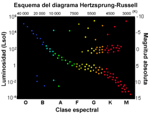 Figura 6. Diagrama Hertzsprung-Russell.El eje vertical es una medida de la energía que libera la estrella (muy relacionada con su magnitud absoluta), mientras que la abscisa nos informa del color o, equivalentemente, la temperatura de la superficie visible. Así, en el eje horizontal se puede encontrar expresado tanto en unidades de temperatura, en colores, o clase espectral. Muchas veces, sobre todo a la hora de clasificar a las estrellas, es esta última la que se toma. Están establecidas según las características de los espectros que se obtienen de las estrellas. Por motivos históricos, las clases espectrales son (de mayor a menor temperatura superficial): O, B, A, F, G, K y M. La letra M se subdivide en las letras N, R y S. Esta secuencia se puede recordar fácilmente con la frase Oh, Be A Fine Girl, Kiss Me!. El intervalo entre una clase y otra se divide en otras 10 partes. Así, el Sol es una estrella del tipo G2. Las estrellas más calientes pertenecen a la clase O5, con temperaturas superficiales de 40 000 K, y las más frías a la clase M8, con unos 2400 K. Las principales características (líneas de absorción) que definen los espectros de cada una de las clases son:
