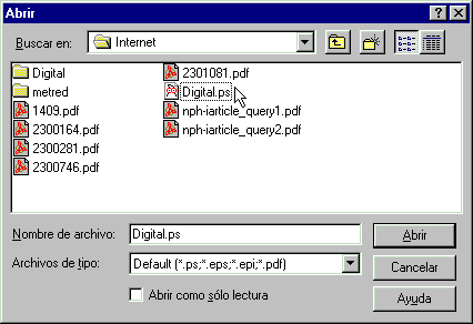 Justo después le aparecerá un nuevo cuadro de diálogo típico de Windows95/98 para seleccionar el archivo PostScript a leer. Diríjase a la carpeta en donde tenga una copia de Astronomía Digital y haga clic en el botón Abrir. ¡Listo!