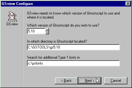 Aquí ha de indicarle en que directorio esta el GhostScript. Sólo ha de cambiar la ruta indicada antes de gs5.10. Por ejemplo, si usted instala el GSview en C:\Archivos de programa\GSview, en el cuadro de texto "In wich directory is Ghostscript located?" ha de aparecer C:\Archivos de Programa\GSview\gs5.10. Presione el botón "Next" hasta finalizar el proceso de configuración.